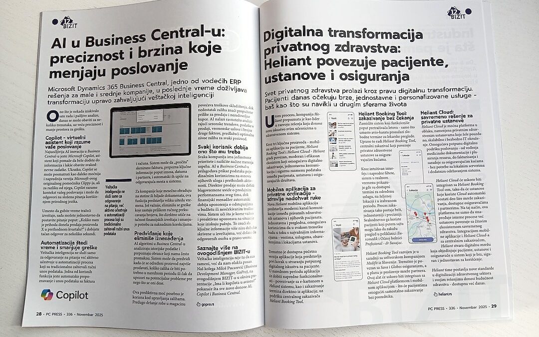 U novembarskom broju PC Press-a, najuticajnijeg časopisa na ovim prostorima u oblasti poslovanja i informaciono-komunikacionih tehnologija, objavljen je članak o našoj novoj mobilnoj aplikaciji za privatne ustanove, sistemu za zakazivanje – Heliant Booking Tool i softverskom rešenju za privatne ordinacije – Heliant Cloud. U nastavku ga prenosimo u celosti.